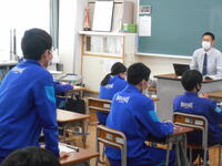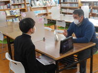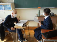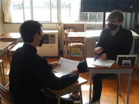 2年生の英語の授業において、ALTのプロフィールカードの情報を基に、来校した5名のALTとの4分間の会話を通して、自ら動画を撮影しながらパフォーマンスを確認しました。ALTに質問したり質問されたりしながら、緊張しつつも、にこやかに表現していました。
