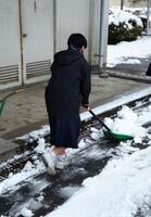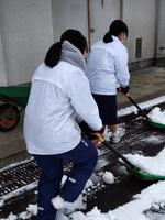 昨日からの降雪で、一面10㎝以上の積雪となりました。教職員が早朝より出勤し、送迎ロータリーや、生徒昇降口、駐輪場等の除雪を行う中、3年生の女子が作業に参加してくれました。
