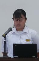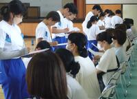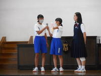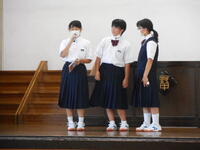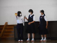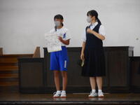 ベルマーク収集活動を行っている福祉委員の生徒が、「ベルマークはこんな物にもついてるよ!」と、寸劇を交えて全校生徒に呼びかけました。生徒会長は、意義ある夏休みにするべく、学年の状況に応じて語りかけていました。