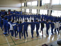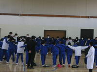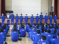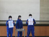 4/16(水)体育祭結団式を行いました。実行委員紹介の後、抽選により、3年1組・2年1組・1年1組が「赤獅子」、3年2組・2年2組・1年2組が「青龍」となりました。団決定後、それぞれの団で応援団員の自己紹介が行われました。また、テーマ曲を発表したり、円陣を組んで一体感を高めたりしていました。体育祭スローガンは、2年生金澤さんが考えた「一致団結 ~魅せろ野中魂」に決定しました。