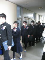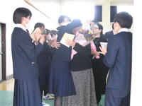 3/28(金)、今年度末をもって退職・異動する教職員の離任式を実施しました。離任する教職員から、生徒に向けて挨拶があった後、代表生徒が手紙と花束を渡して別れを惜しみました。1・2年生の他、大勢の卒業生が駆けつけてくれました。異動の詳細は学校だより4月号でお知らせします。この日、式に参列した教職員の数は、異動者7名、残留者6名でした。