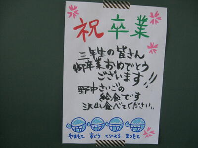 3/11(火)第78回 野崎中学校卒業証書授与式を挙行しました。48名の生徒が晴れやかに卒業証書を手にし、それぞれの進路に向かって旅立ちました。「在校生」「3年学年主任」「給食調理員」その他、たくさんのメッセージが校内の様々な場所に掲げられ、門出を祝福しました。