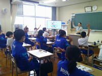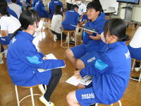 7/7(月)小中一貫教育の取組の1つとして、中学校教員による小学6年生英語の授業を実施しました。この日の授業では、「石上小・薄葉小1組・薄葉小2組」の三人一組でグループをつくり、英語で自己紹介をし合いました。
