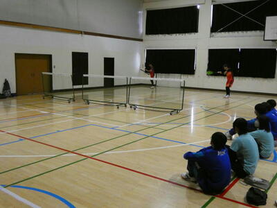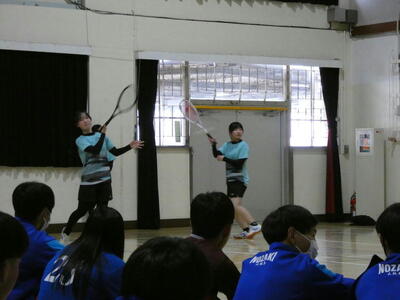 体育館の中で、パフォーマンスを行い1年生に一生懸命アピールしていました。